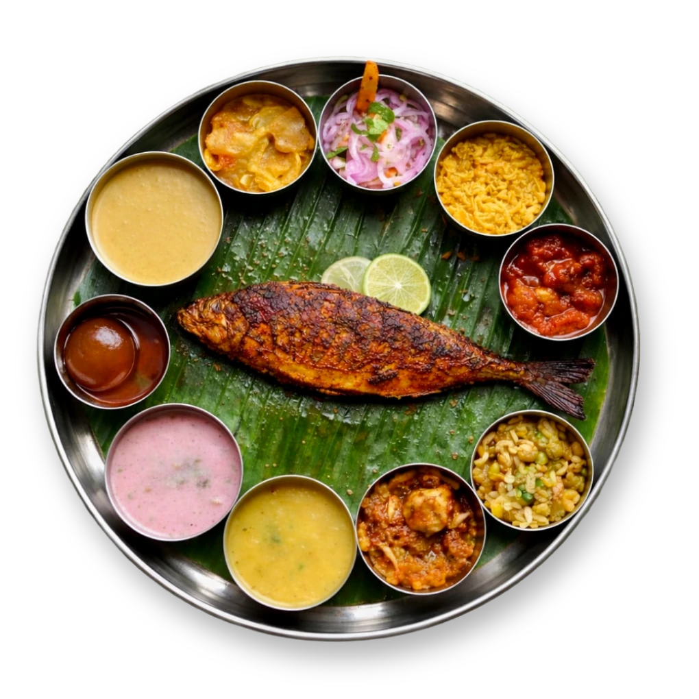 You can choose from Pomfret, Prawns, Surmai, Bangde, Chicken, and Veg Thalis, all prepared in authentic Mangalorean style.