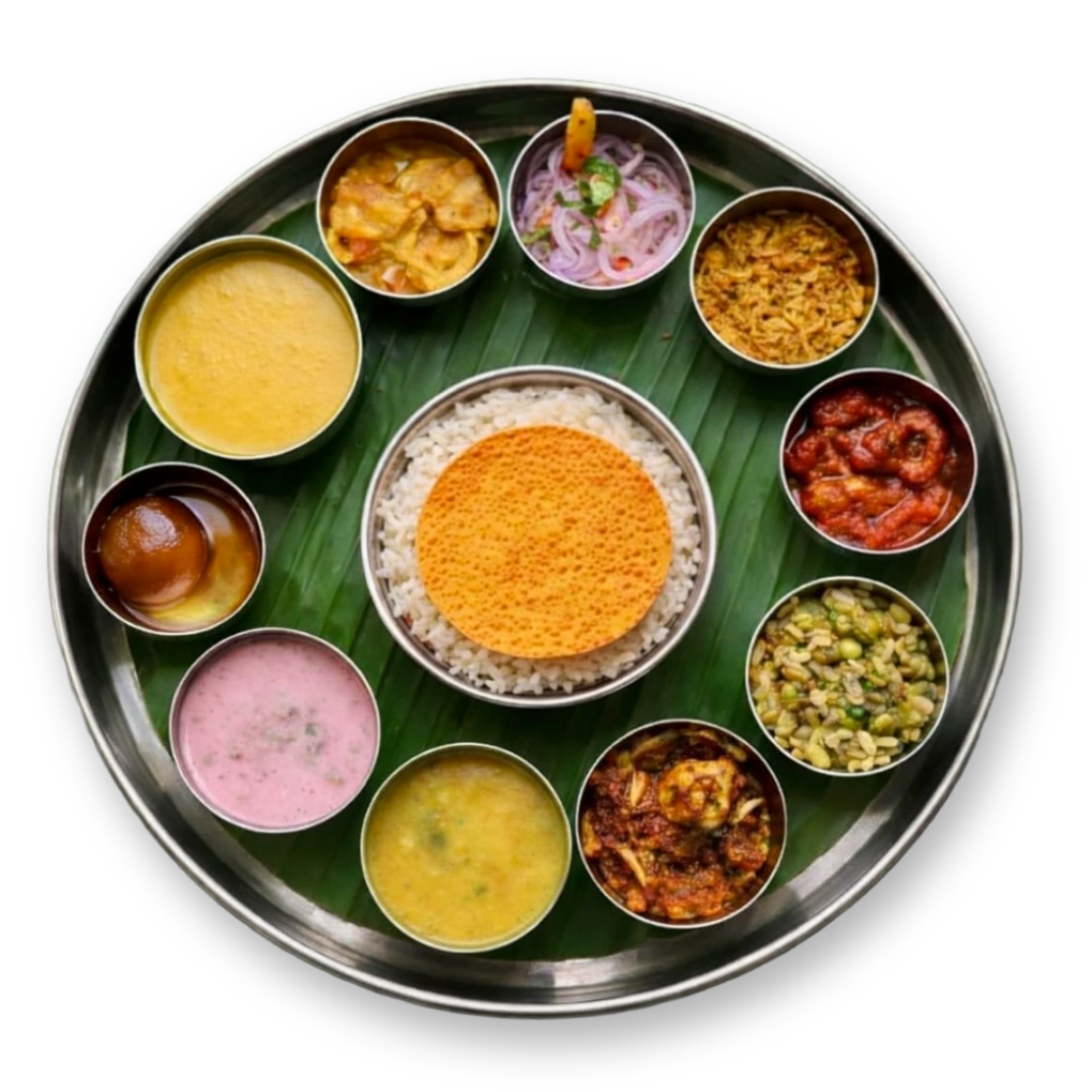 Each thali includes a mix of rice, dal, sabjis or gravies, salad, sweets, and other accompaniments, making it a wholesome and satisfying meal.